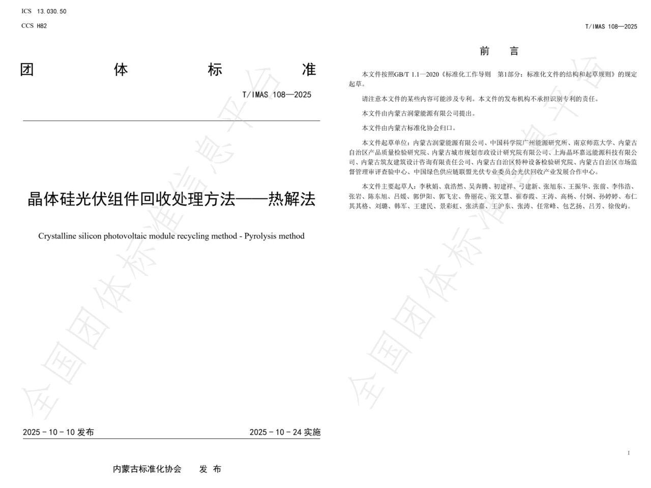近日,由内蒙古润蒙能源有限公司(以下简称“润蒙公司”)作为主要起草单位参与编制的《晶体硅光伏组件判废导则 》《晶体硅光伏组件回收处理方法——热解法》两项团体标准,已于2025年10月10日正式发布。